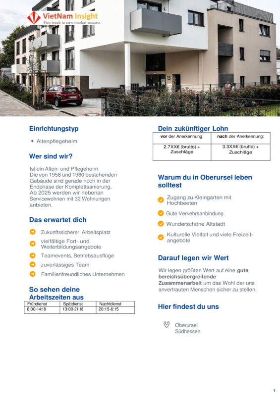 Hiện tại chúng tôi đang cần tuyển 5 vị trí Điều Dưỡng Viên làm việc tại bang Hesse, nằm ở trung tâm của phía Tây nước Đức từ tháng 2 năm 2025.